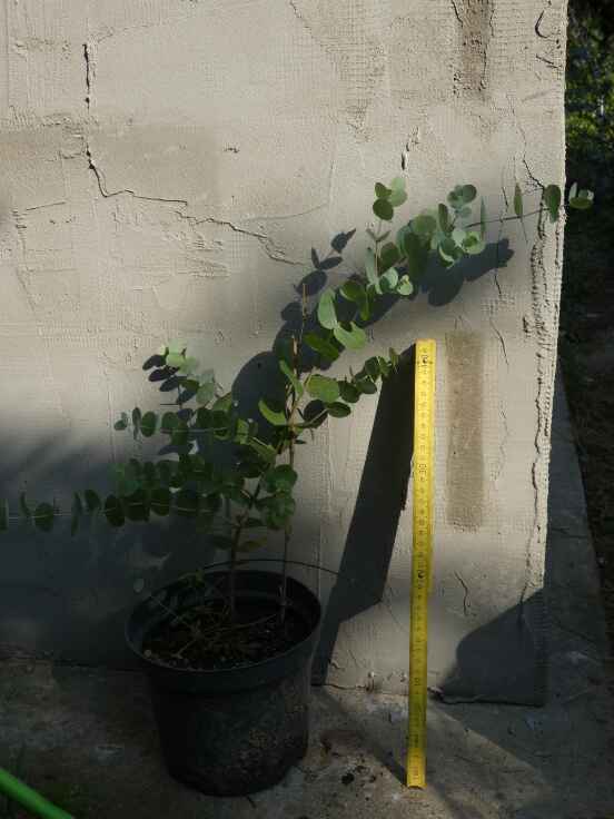 Evkalipt cinerea ni visokoraslo drevo, odeto vseskozi v otroške (ovalne) ali delno odrasle liste (dobijo pecelj in postanejo nekoliko bolj srčaste oblike).